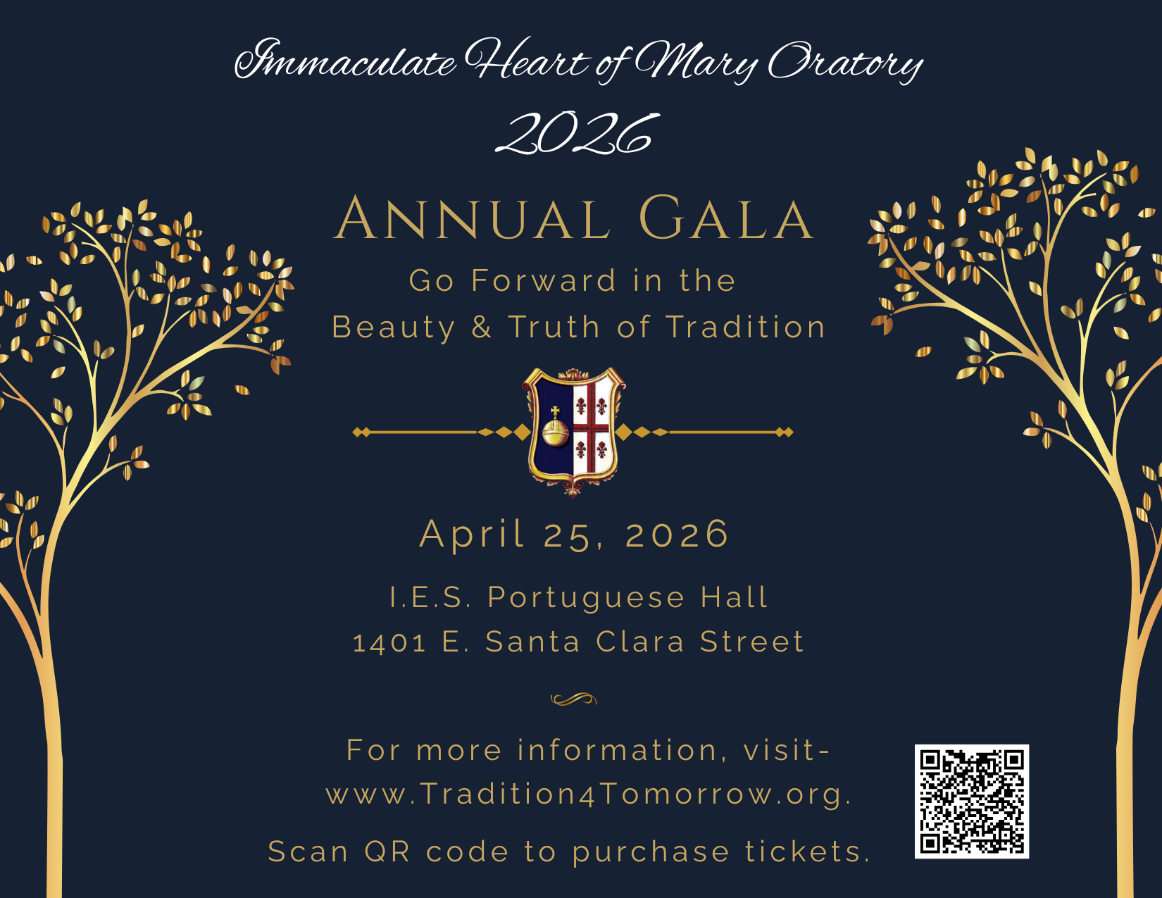 We are delighted to announce the Second Annual Fundraising Gala for the Oratory of the Immaculate Heart of Mary, taking place on Saturday, April 25, 2026, at the historic IES (Portuguese) Hall, 1401 E. Santa Clara Street in San Jose (right next to Five Wounds Church).